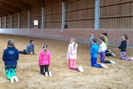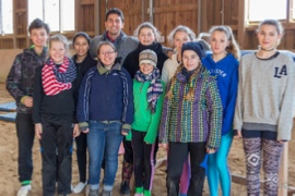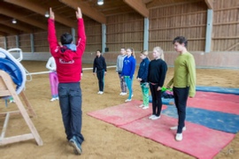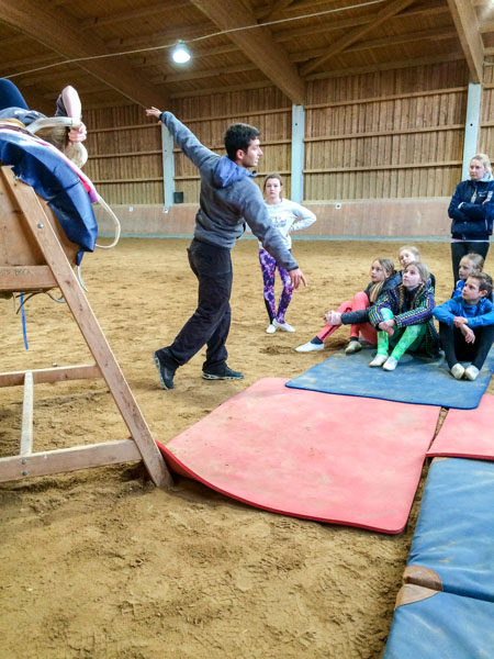 Der Lehrgang mit dem amerikanischen Weltmeister Devon war ein voller Erfolg. Es haben alle 12 Turniergruppen daran teilgenommen und im Gruppen-Einzelcoaching sehr viel gelernt und neue Anregungen bekommen. Devon war mit unglaublich viel Herz und Engagement bei der Sache und hat auch dem allerkleinsten A-Gruppen-Voltigierer genauso viel Aufmerksamkeit geschenkt, wie einem S Voltigierer. Die Voltigierer und Ausbilder hatten außerdem viel Spaß an seiner sehr bildhaften Sprache und Gestik – es wurde trotz hässlichem Aprilwetter mit Orkansturm viel in der Halle gelacht. Selbst als das Hallendach der kleinen Voltigier-Halle in Teilen weggeflogen war, ließ sich keiner davon abhalten den Kurs weiter zu machen und die Kursteilnehmer teilten sich dann den Platz mit den Reitern in der großen Halle. Wir freuen uns auf ein Wiedersehen mit Devon – vielleicht kommt er sogar schon in den Sommerferien wieder nach Gut Mischenried.